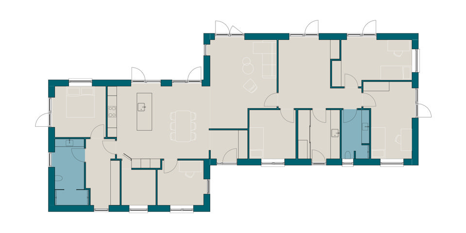 Længe- og vinkelhuse kan forskydes, så der opstår spændende indretningsmuligheder.
