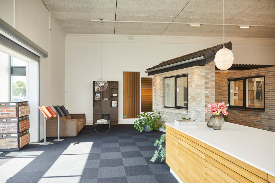Besøger du os, viser vi hellere end gerne rundt i det store showroom, som er indrettet med eksempler på de nyeste tendenser inden for nybyggeri. Her kan du nærstudere materialeprøver på mursten, akustiklofter, trægulve, klinker, dørhåndtag, udebelysning og meget, meget mere.